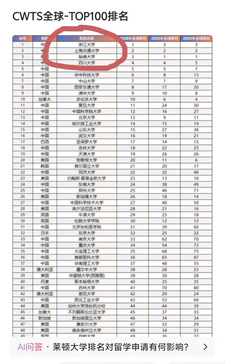 2025年10月29日发布的莱顿世界大学排名(传统版)显示,位列榜单首位的是中国浙江大学,而之前多年来铁定这一荣誉的,多是世界上科研产出最高效大学的美国哈佛大学!
